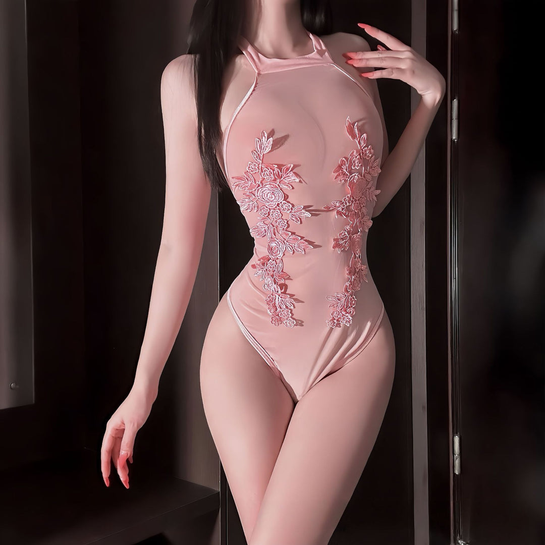 Deep V Halter Lace Teddy Bodysuit