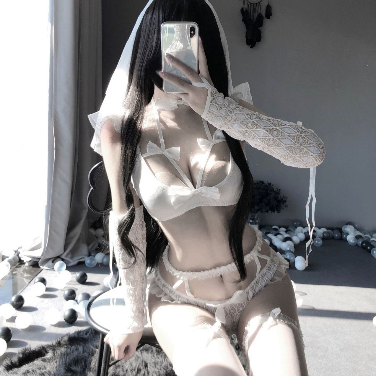Step into a world of dark temptation with this seductive black lace multi-piece lingerie set. The daring deep-cut bra frames your curves with irresistible intensity. while the sheer lace sleeves and mysterious veil add a teasing. forbidden allure. Every strap. cutout. and lace detail is designed to sculpt your silhouette and amplify your sensual presence.