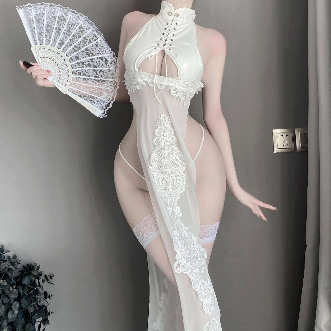 Color-Block Sheer Lace Cheongsam Lingerie Set – Backless Cut-Out PU Body Suit