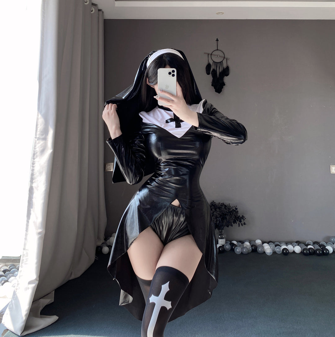 Shiny Nun Cosplay Costume Set – Long Sleeve Bodycon Mini Dress with Headpiece & Thigh-High Stockings